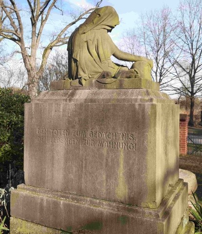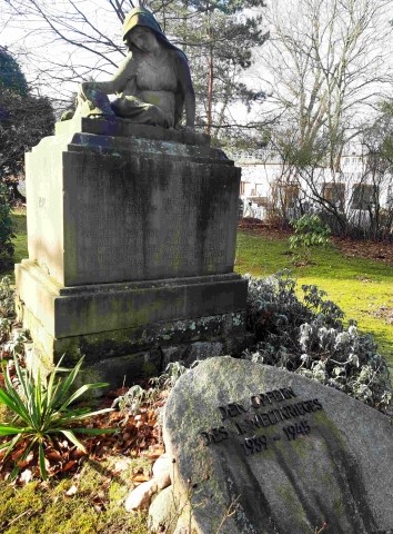 Denkmal für die Gefallenen des Ersten Weltkriegs: Sandstein-Quader mit aufgesetzter trauernder Frauenfigur und Stahlhelm. Davor ein abgelegter Gedenkstein für Opfer des Zweiten Weltkriegs (ohne Namen).