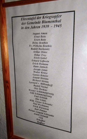 Die Daten zu den Gefallenen des 1. Weltkriegs konnten aus den offiziellen Verlustlisten (o.V.L.) dieses Krieges ergänzt werden. Im Kirchenbuch von Blumenthal befindet sich eine mehrseitige Auflistung aller Kriegsteilnehmer und Gefallenen des 1. Weltkriegs mit sehr vielen Infos. Von dort wurden weitere Daten entnommen. Für die Auflistung aller Namen und Daten der überlebenden Kriegsteilnehmer fehlte die Zeit.