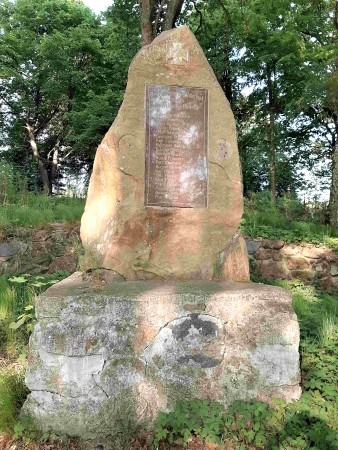 Denkmal für die Gefallenen des Ersten Weltkriegs: Hoher Natursteinsockel mit aufgesetztem Findling, daran eine Widmungs- und Namenstafel.