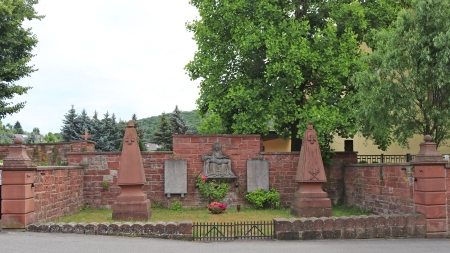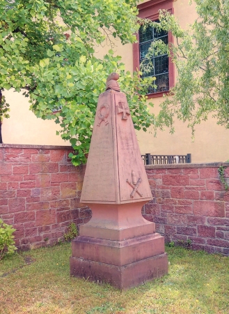 1870/71: Ein aus Sandstein bestehender, pyramidenförmiger Gedenkstein, vorne unten zwei gekreuzte Kanonen, darüber eine Granate. Oben ein deutsches Kreuz und als Abschluss ein Helm.