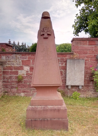 1914-18: Ein aus Sandstein bestehender, pyramidenförmiger Gedenkstein, Oben ein deutsches Kreuz und als Abschluss ein Helm.