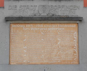 Brunnen beim Rathaus: Steintafel mit den Namen der Gefallenen des Ersten Weltkriegs.