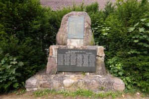 Kriegerdenkmal vor St.-Thomas-Kirche in Bordenau. Findling (Tafel Erster Weltkrieg) auf Natursteinsockel (Tafel Zweiter Weltkrieg).