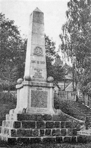 Denkmal für die Gefallenen des Ersten Weltkriegs an der Kirche: Vierstufiger Natursteinsockel, darauf ein verzierter Quader mit eingelassenen Namenstafeln und aufgesetztem Obelisken mit EK-Zeichen und der Widmung (abgerissen). Drei Namenstafeln wurden gerettet und 2003 auf dem alten evangelischen Friedhof in einen neuen Natursteinquader mit gerundetem Oberteil und krönendem Kreuz integriert.