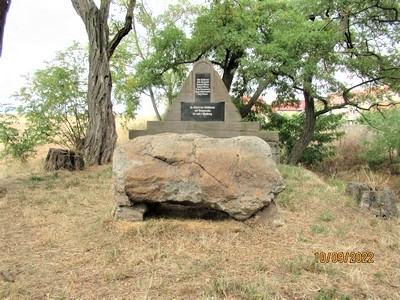 Unmittelbar neben dem Gutshaus von Bismarck befindet sich die Anlage. Vor das eigentliche Denkmal ist ein Felsblock vorgelagert, der den Blick auf das Denkmal etwas einschränkt. Es steht auf einem leichten Hügel unter einer Baumgruppe mit Feld im Hintergrund. Gestaltet wurde die Anlage als eine Art Schnitt durch eine Pyramide. Es wurde bossierter Sandstein verwendet. In der Mitte zwei Tafeln, wovon die obere die Namen von Opfern aus den zwei Weltkriegen des 20. Jahrhunderts ohne Differenzierung trägt und die darunterliegende die Widmung.