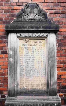 Stein-Gedenktafel für die Gefallenen des Ersten Weltkriegs an der Außenwand der evangelischen St. Lukas Kirche.