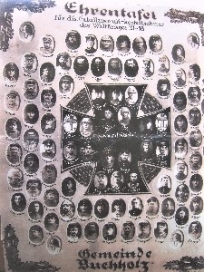 Die Ehrentafel zeigt - bis auf die Gefallenen H. Teege und H. Röhring - Fotos aller aufgeführten Gefallenen und Kriegsteilnehmer (KT).