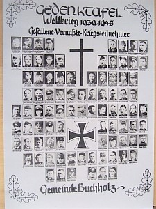 Ehrenblatt (DIN-A3) mit Fotos und Daten der Gefallenen und Kriegsteilnehmer des Zweiten Weltkrieges aus der Gemeinde Buchholz.