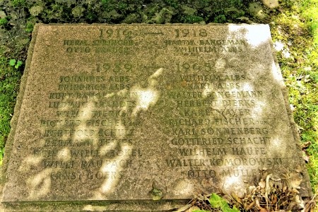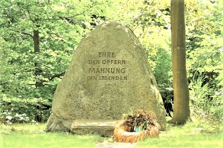 Schlichter Feldstein in einem kleinen abgegrenzten Areal (Kampstraße, linke Seite). Davor liegend eine Gedenkplatte aus Stein