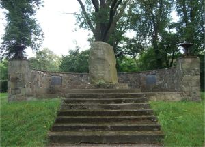 Denkmalanlage für die Gefallenen des Ersten Weltkriegs bei der Burg Stargard auf dem Burgberg. Großer Findling, der von einer Natursteinmauer umgeben ist.