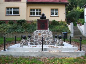 1870/71: Auf Natursteinsockel eine Gedenktafel, gekrönt mit Kanonenkugeln. Vier kleine Steinhaufen mit jeweils einer Kanonenkugel.