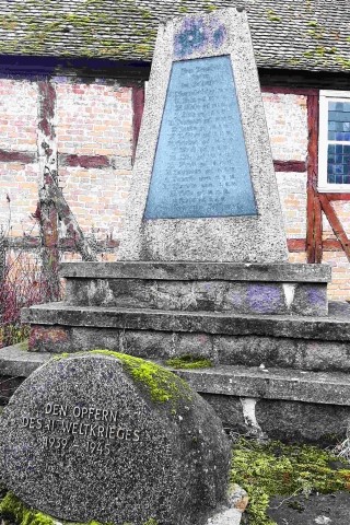 Denkmal für die Gefallenen des Ersten Weltkriegs: Dreistufiger Natursteinsockel, darauf eine aufgerichtete Granitplatte in Form einer stumpfen Pyramide mit eingelassener Widmungs- und Namenstafel. Davor ein später aufgestellter Findling zum Gedenken an die Opfer des Zweiten Weltkriegs (ohne Namen)