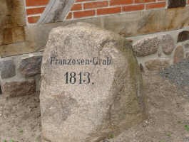 Weiterhin ein Findling direkt vor der Kirche für einen toten Franzosen aus dem Jahr 1813.