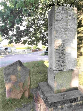 Die Stele lag bis vor einigen Jahren noch umgestürzt am Rande des Platzes ehe sie wieder errichtet wurde. Die Inschriften sind leider teils schon verwittert und sie konnten nur mit Hilfsmitteln sichtbar gemacht werden. Aus der offiziellen Verlustliste des Krieges konnten unsichere Namen korrigiert werden. Die Todesjahre sind sicher, nur bei den genaueren Daten bestehen Unsicherheiten. Neben dem Denkmal steht noch ein Findling mit einem EK-Zeichen und nicht mehr lesbaren Inschriften. Nur die Zahl 1866 ist noch lesbar.