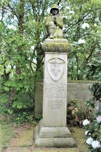 Auf dem Friedhof der St. Siegismund-Kirche Gedenkstätte für die Opfer beider Weltkriege: Stele mit kniendem Soldaten, darunter der gekreuzigte Jesus, auf drei Seiten Namen (nach Orten).