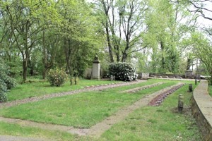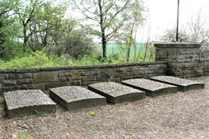 Metalltafeln für den Zweiten Weltkrieg. Kriegsgräberstätte für 68 Soldaten (die Namen der Kriegsgräber sind zusätzlich auf in Steinplatten am Stirnende der Gedenkstätte vorhanden).