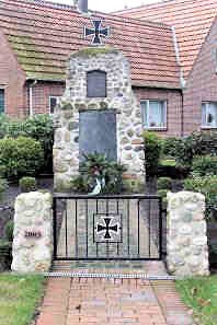 Natursteinmauer aus kleinen Findlingen in gepflegter Anlage: Denkmal mit Andreaskreuz bekrönt, vorne eingelassen zwei beschriftete schwarze Granittafeln,