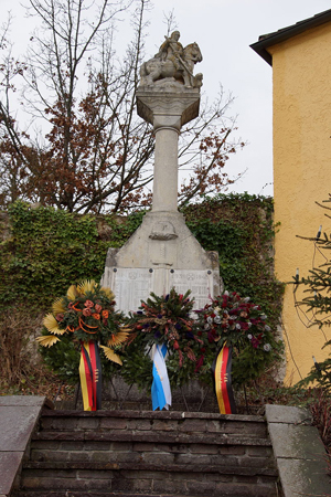 Denkmal auf dem Deuerlinger Friedhof, zusätzliche Gedenktafel an der Außenseite der Kirche mit den Namen der vermissten Soldaten.