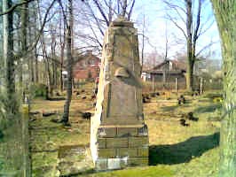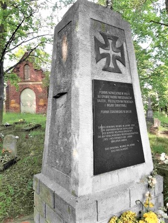 Denkmal für die Gefallenen des Ersten Weltkriegs auf dem alten katholischen Friedhof an der ul. Sielska: Abgestufter Obelisk mit eingelassener Widmungs- und Namenstafel, sowie großem EK-Zeichen im oberen Bereich und Stahlhelm-Reliefs an den Seiten.