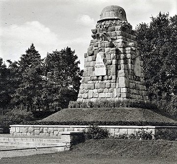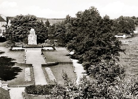 Ehemaliges Denkmal für die Gefallenen der Stadt im Ersten Weltkrieg am See: Kleiner Hügel mit breiter Naturstein-Stele mit eingelassenen Widmungstafeln und krönendem riesigen Stahlhelm auf einem Ehrenkranz. Über der vorderen Tafel war eine Adler-Figur angebracht. Vor dem Denkmal wurde eine gärtnerische Anlage geschaffen (nach 1945 abgerissen).
