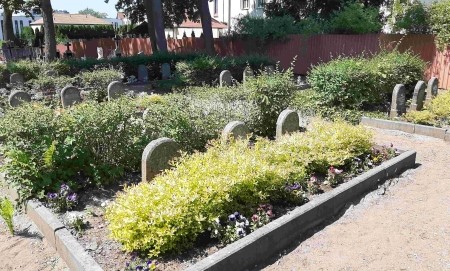 Kriegsgräberstätte für Gefallene des Ersten Weltkriegs auf dem städtischen Friedhof (ehemaliger katholischer Friedhof) an der Kardynała St. Wyszyńskiego Straße: Drei Reihen von Grabsteinen.