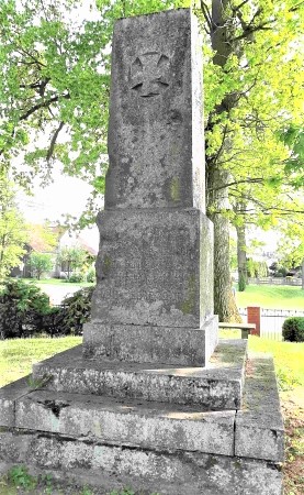 Denkmal für die Gefallenen des Ersten Weltkriegs im Kirchhof: Abgestufte viereckige Stele mit Inschriften und EK-Zeichen im oberen Bereich.