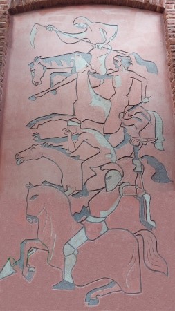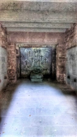 Die Kreuze im Hintergrund erinnern an einen Friedhof. Darüber die Inschrift "UNSEREN TOTEN HELDEN". In den Raum hinein ragt ein Sarg mit Kranz. Auf der Sargabdeckung ein "Eisernes Kreuz" und die Inschrift "Er war getreu bis in den Tod" vertieft in den Stein eingearbeitet.