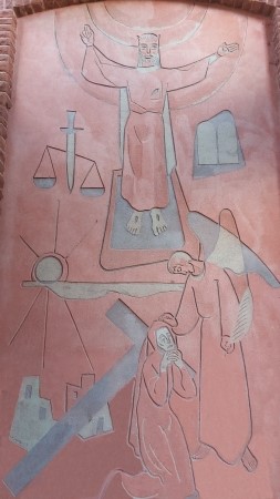 Über einem an eine Krypta erinnernden unterirdischen Gewölbe erhebt sich ein vorn und hinten offener Turm aus rotem Sandstein. Die beiden Seitenwände des Turms wurden vom saarländischen Künstler Richard Eberle (1918-2001) in Sgraffito-Technik gestaltet. Auf der einen Wand verkörpern die vier apokalyptischen Reiter die Geiseln der Menschheit. Auf der anderen Wand symbolisiert die Auferstehung Jesu den Sieg des Lebens über den Tod. Auf dem Mosaik am Ende der Gruft eine trauernde weibliche Figur, kniend neben einem aufgebahrten Soldaten, die Hände gefaltet.