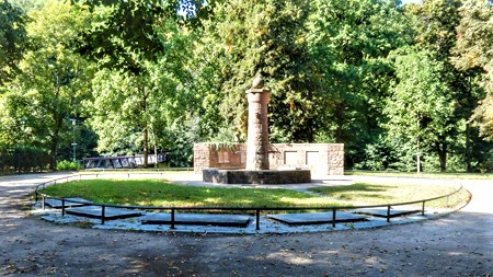 Vor dem Brunnen, in einem Teilkreis liegend, fünf Metalltafeln mit den Namen der im Zweiten Weltkrieg Gefallenen.