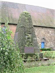 Ehrenmal neben der Kirche für die Kriegstoten beider Weltkriege: Eisernes Kreuz, Sandsteinrelief aus den 1920er Jahren „Trauernde“ mit Umschrift,