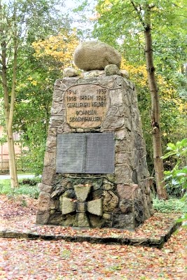 Großer, beeindruckender Obelisk (ca. 5 Meter Gesamthöhe) aus Feldsteinen gemauert mit Inschrift, Metallplatte für die Gefallenen des Ersten und Zweiten Weltkrieg