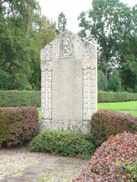 Denkmal auf dem Kirchhof mit Widmung im Giebel beiderseits vom Kopf des Erlösers. Die stark verwitterte Steinplatte mit den Namen und Sterbedaten wird rechts und links gerahmt von Eichenlaub, jeweils einem Schwert und Stahlhelm.