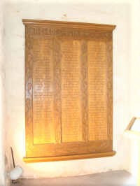 Im Eingangsbereich der St.-Urbanus-Kirche zwei große Tafeln aus Eichenholz mit Girlanden aus Eichenlaub und den Namen der Opfer des Zweiten Weltkrieges.