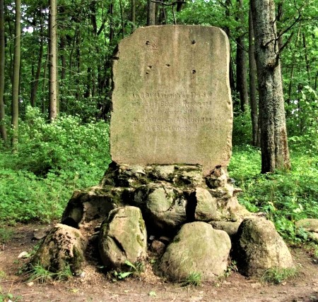 Denkmal zum Gedenken an das Gefecht bei Drengfurth 1914 am Bismarckturm: Feldsteinhaufen mit aufgesetztem Findling mit Widmungsplakette, gekrönt von einem Adler (Plakette und Adler fehlen heute).