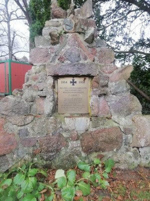 Mit Natursteinen gemauertes Denkmal steht vor der Kirche, neben dem Eingang zum Friedhof.