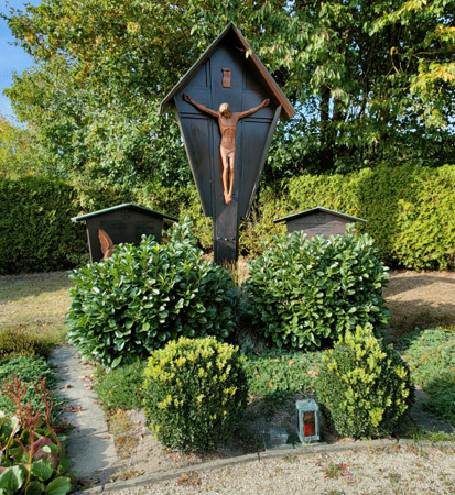 Denkmal aus Holz auf dem Friedhof, im Zentrum Jesus am Kreuz.