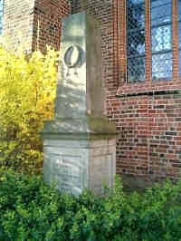 An der Seite der Kirche ein einfacher Obelisk mit einem Lorbeerkranz auf der Vorderseite. Auf dem Sockel Inschriften und Namen.