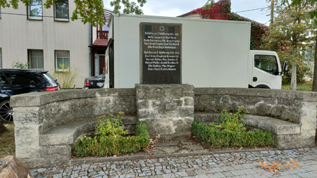 Gedenktafel aus schwarzem Stein, der auf einer halbrunden Mauer steht.