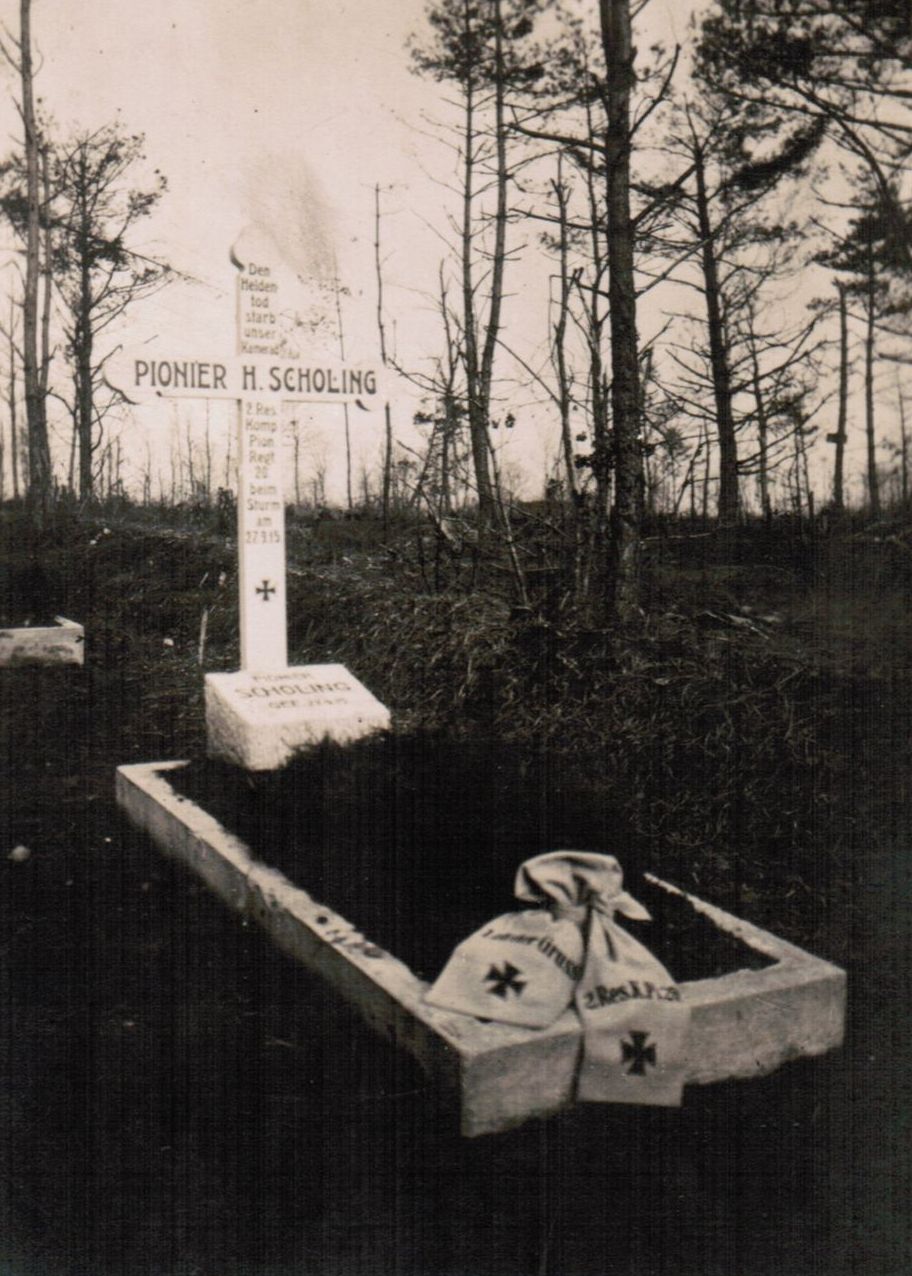 Der Text auf dem abgebildeten Grabkreuz lautet "Den Heldentod starb unser Kamerad Pionier H. Scholing 2. Res. Komp. Pion. Regi. 20 beim Sturm am 27.09.1915".