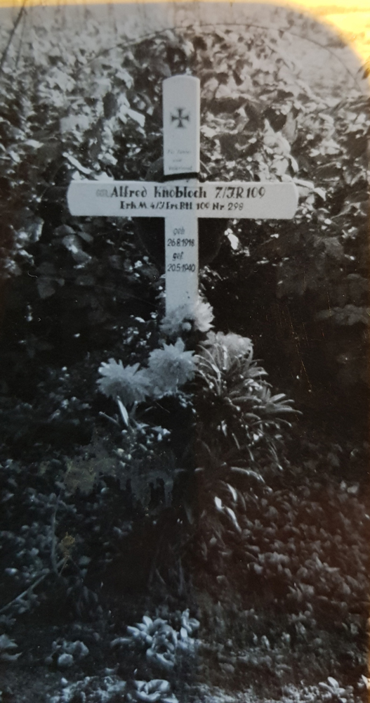 Gefreiter | KNOBLOCH | Alfred | 26.08.1918 | 20.05.1940 Fontenoy, Nähe Antoing/Tournai (Belgien) | Inf. Reg. 109, 7.Komp | Erstbestattung Soldatenfriedhof Antoing, Grab 11, Einzelgrab, Umbettung auf die Kriegsgräberstätte in Lommel: Block 25 Grab 636 |