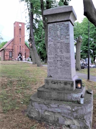 Denkmal für die Gefallenen des Ersten Weltkriegs vor der Kirche: Abgestufte Stele mit Inschriften an allen vier Seiten.