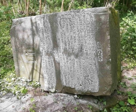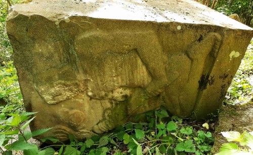 Reste eines Denkmals für die Gefallenen des Ersten Weltkriegs: Umgestürzter Quader mit dem Relief eines knienden nackten Kriegers mit Schwert und den Namen der Gefallenen. Kleiner Stein mit Widmung.