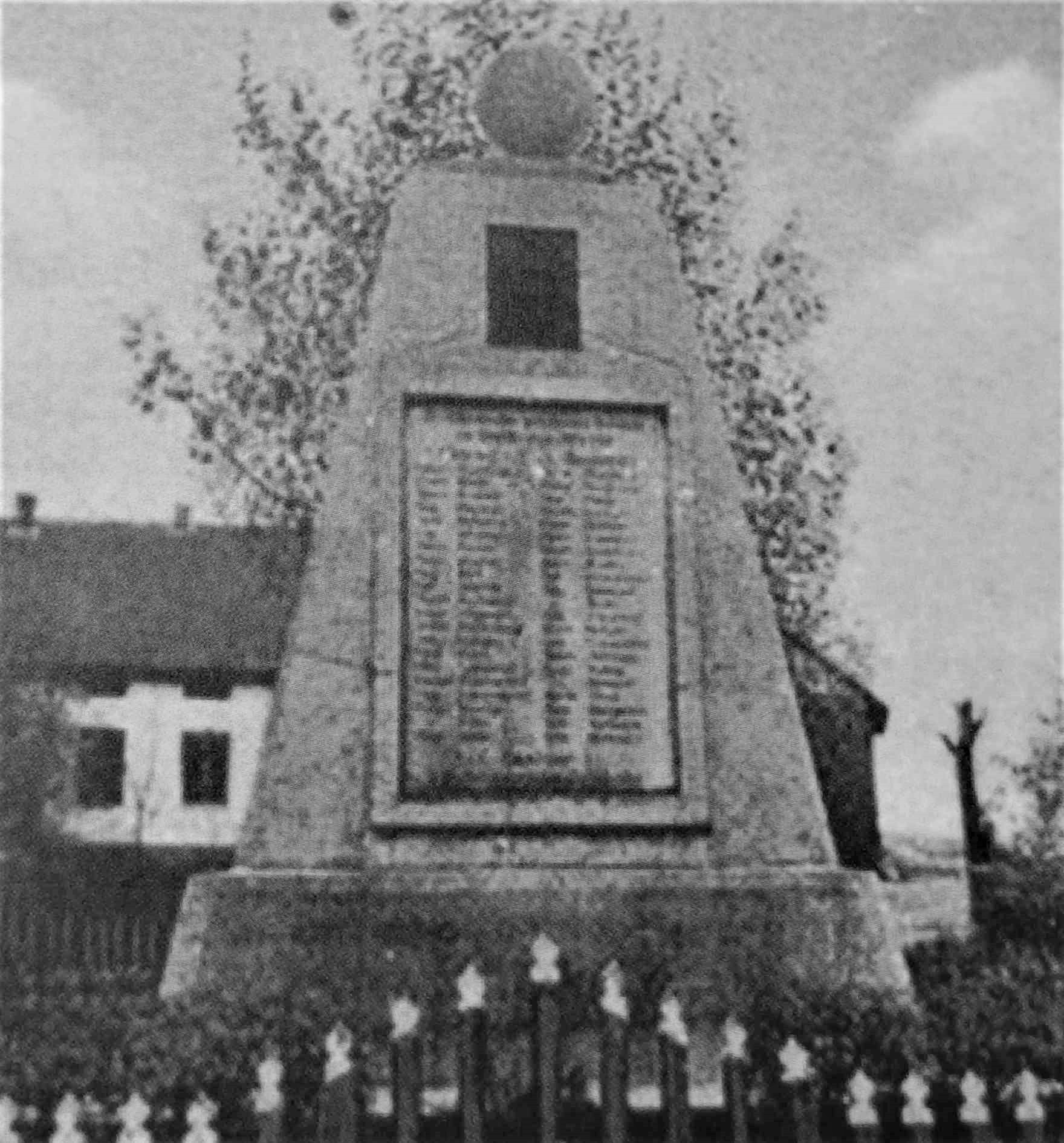 Ehemaliges Denkmal für die 45 Gefallenen des Ersten Weltkriegs: Dreieckige stumpfe Pyramide mit eingelassener Widmungs- und Namenstafel und krönender Kugel. Vom Denkmal ist nur noch der Sockel erhalten.