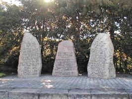 Auf dem Friedhof drei behauenen Feldsteinen mit Widmung und Namen der Opfer beider Weltkriege; der mittlere Stein für den Ersten Weltkrieg,
