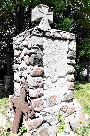 Aus Feldsteinen gemauertes Denkmal für die Gefallenen des Ersten Weltkriegs mit quadratischem Grundriss, Höhe ca. 3 Meter. Aufgesetzt ein steinernes Eisernes Kreuz. Es steht auf dem alten Teil des Friedhofs mit alten deutschen Grabkreuzen an der Ortseinfahrt. Namentafeln fehlen.