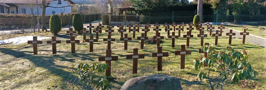 Freistehende Stele auf mehrstufigen Sockel. Auf der Stele ein Kreuz. 47 einzelne hölzerne Grabkreuze mit Namensplaketten - davon 7 von unbekannten Soldaten.