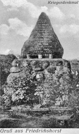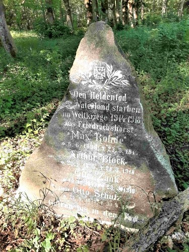 Rest eines Denkmals für die Gefallenen des Ersten Weltkriegs auf dem ehemaligen evangelischen Friedhof am Ortsrand: Hoher Sockel aus Feldsteinen mit aufgesetztem dreieckigem Felsblock. Nur der Felsblock ist noch erhalten.