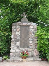 Aus kleinen Findlingssteinen gemauertes Denkmal mit einem Eisernen Kreuz obenauf und Namenstafeln.