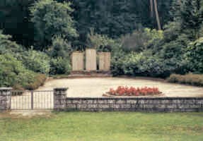 Denkmal am Lehmweg. Kleiner Platz mit niedriger Mauer, darauf drei Granitplatten mit den Namen der Gefallenen.