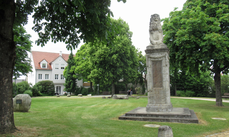 Ein steinerner Löwe thront auf dem Denkmal für den Feldzug von 1870/71, das auf dem Gelände des ehemaligen Friedhofs steht.